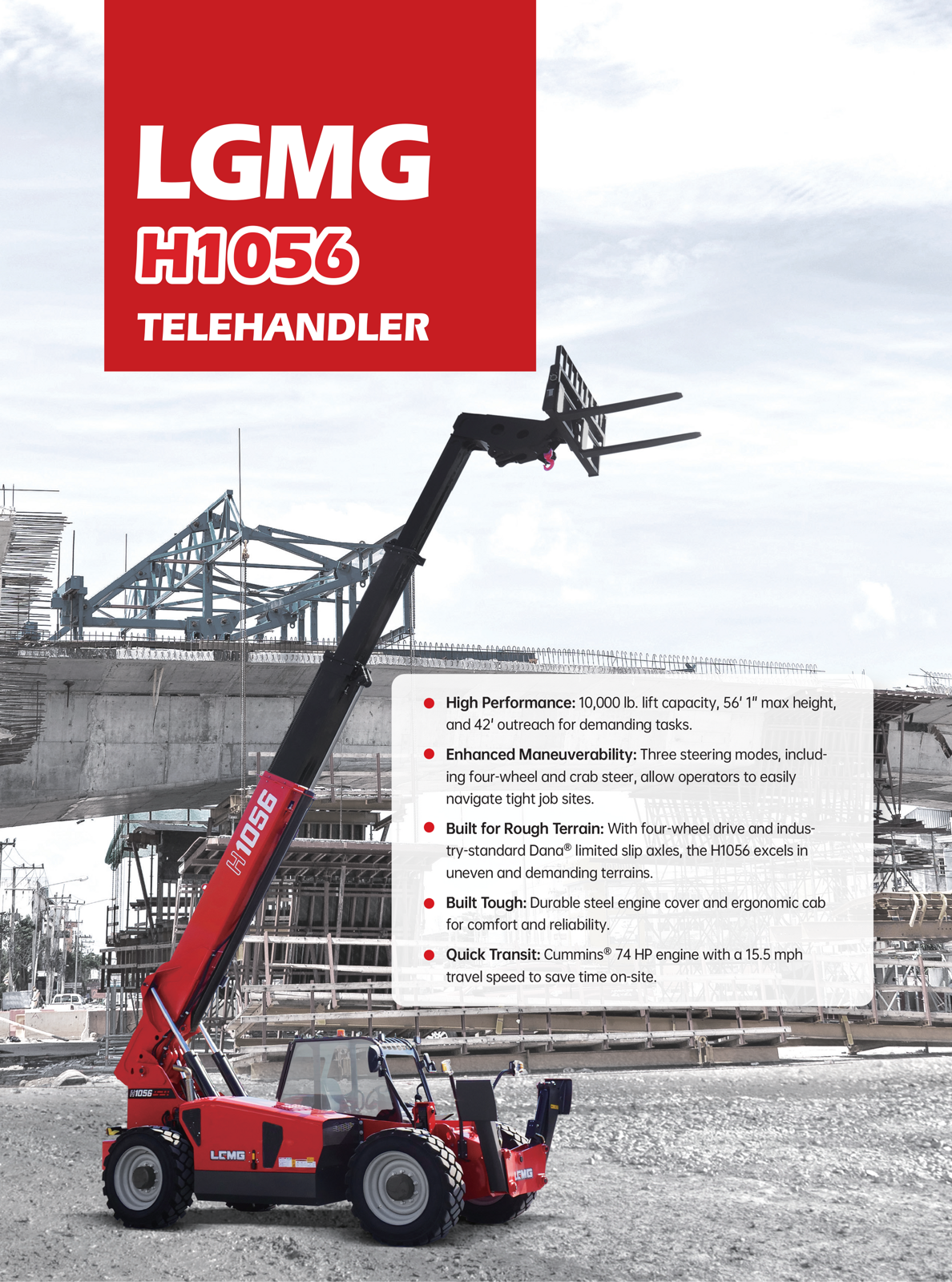 • Built for Rough Terrain: With four-wheel drive and industry-standard Dana® limited slip axles, the H1056 excels in uneven and demanding terrains.
